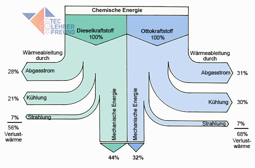 Die Energieströme von Diesel- und Ottomotoren lassen sich anschaulich mit Hilfe von so genannten Sankey-Diagrammen zeigen (Bild unten).