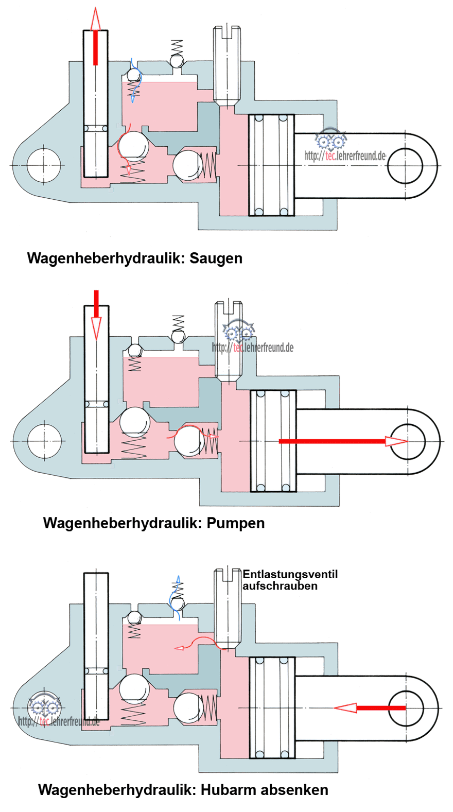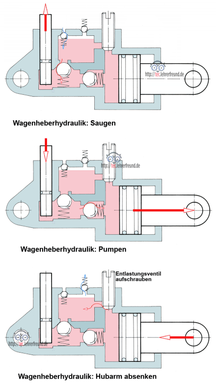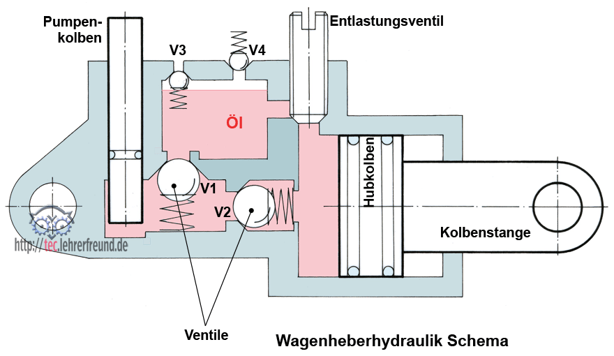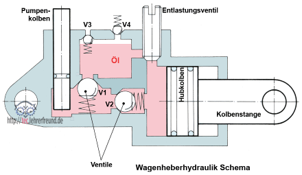 Beim Auf- und Abbewegen des Pumpenkolbens wird zuerst Öl aus einer Vorratskammer angesaugt, dann - beim Pumpen - zum Hubkolben gedrückt. Die unterschiedlichen Kolbenflächen haben eine Kraftübersetzung zur Folge. Sie ist durch das Verhältnis der Kolbenflächen festgelegt. Die Ventile V1 bis V4 verschließen die Ölräume gegeneinander bzw. dienen als Luftnachsaugeinrichtungen.