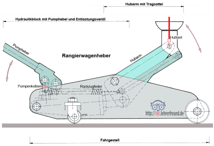 Zwischen den beiden Seitenwänden des Fahrgestells liegen der Hydraulikblock mit Pumpenkolben und Entlastungsventil - das Ölsteuersystem also, und der Hubarm. Die beweglichen Rollen erlauben das Rangieren in verschiedenen Fahrrichtungen. Beim Pumpen (Pumpenhebel) drückt Öl die Kolbenstange nach rechts und hebt den Hubarm an. An den Wänden unten und am Hubarm oben gelagerte Parallelschwingen gewährleisten, dass der Tragsattel in jeder Hubarmposition senkrecht steht. Wird das Entlastungsventil, eine einfache Schlitzschraube, geöffnet, fährt der Arbeitskolben, unterstützt von einer Zugfeder, wieder zurück und der Hubarm schwenkt nach unten.