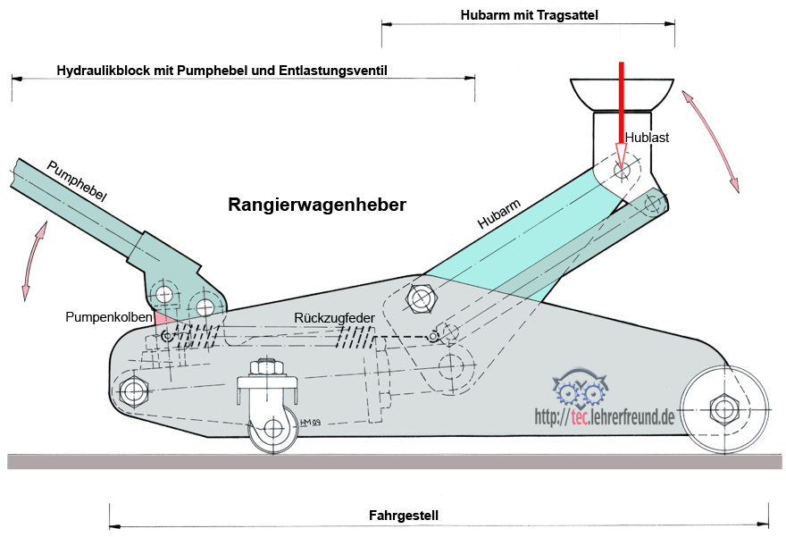 Der Wagenheber ist für eine Hublast bis 2 Tonnen (= 2 000 daN = 20 000 N) ausgelegt. In den Aufgaben gehen wir davon aus, dass diese Höchstlast auf den Sattel aufgesetzt ist. Drehpunkt des Hubarms ist die Achse 0.