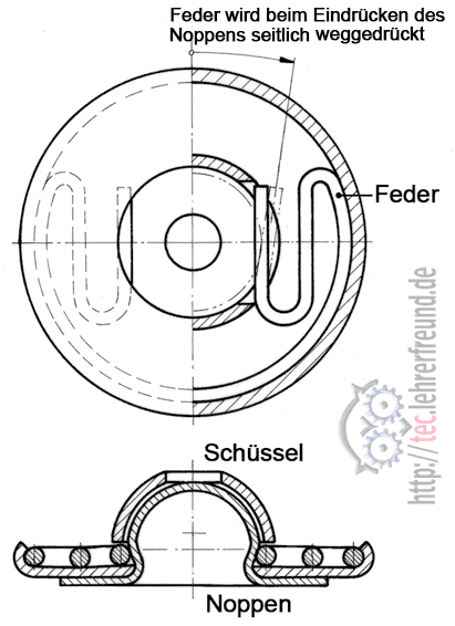 Das rettende Geheimnis ist ein elastisches Element, eine spezielle, zum S geformte Feder. Sie ist in den umgebördelten Rand der Schüssel eingelegt und ragt durch zwei kleine Schlitze in die kugelige Schüssel hinein. Beim Eindrücken des Gegennoppens wird das Federende seitlich weggedrückt, um sich nach dem völligen Einschnappen an den Noppenhals anzulegen.