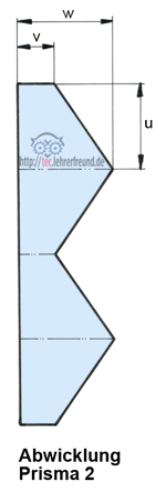 Prisma 2: Der Mantel besteht aus den vier rechteckigen Seiten mit Breite u. Die Begrenzungen der Dreiecksform erhält man durch Herausmessen der Maße v und w (aus Bild oben »Prisma durchdringt Prisma«). Die Länge der schrägen Dreieckslinie und die Seitenlänge der Raute sind identisch.