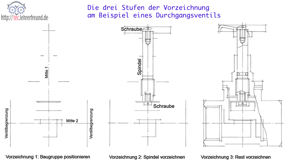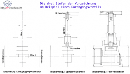 Zeichnung eines Durchgangsventils (Hahn)Vorzeichnung des Durchgangsventils in drei Stufen