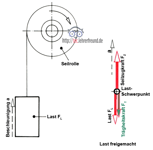 Die Seiltrommel soll eine Last FL = FG nach oben ziehen und dabei beschleunigen. mL = 800 kg; a = 0,24 m/s2.