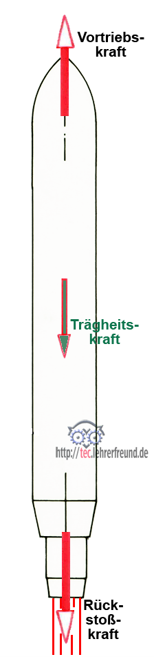 Bild unten: Kräfte an einer sich beschleunigenden Rakete. Die Größe des Trägheitswiderstands hängt von der Raketenmasse und dem Beschleunigungswert ab.