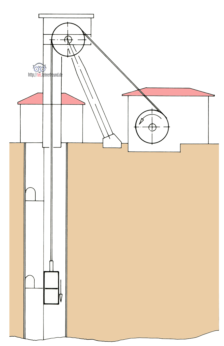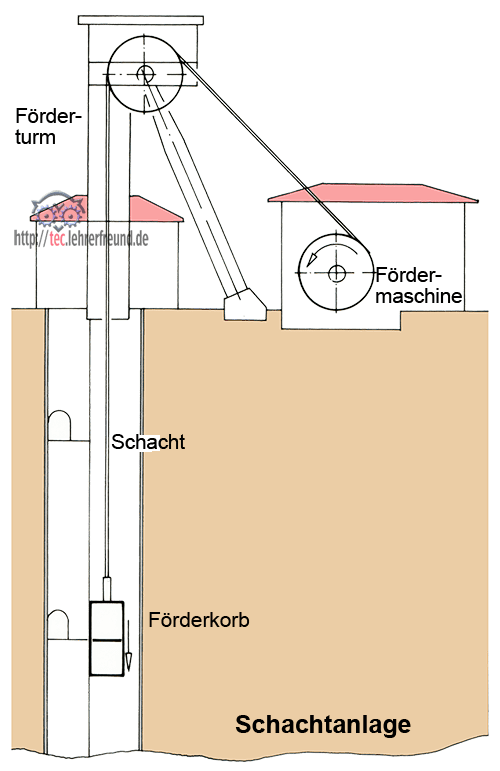 Anmerkung: Bergwerke unter Tage werden meist durch senkrechte Schächte von der Erdoberfläche aus erschlossen. Als Transportmittel für Personen und Material dient der Förderkorb, eine robuste Aufzugskabine. Sie hängt im Schacht an einem Seil und wird von einer Fördermaschine über die Seilrolle im Förderturm auf- und abwärts bewegt.