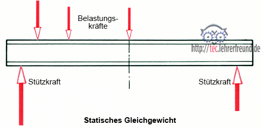 Beispiel Stahlträger. Er ist im Gleichgewicht, wenn die ihn belastenden Kräfte und die Stützkräfte gleich groß sind und gegensinnig wirken. Damit heben sie sich auf und der Träger ist im statischen Gleichgewicht.