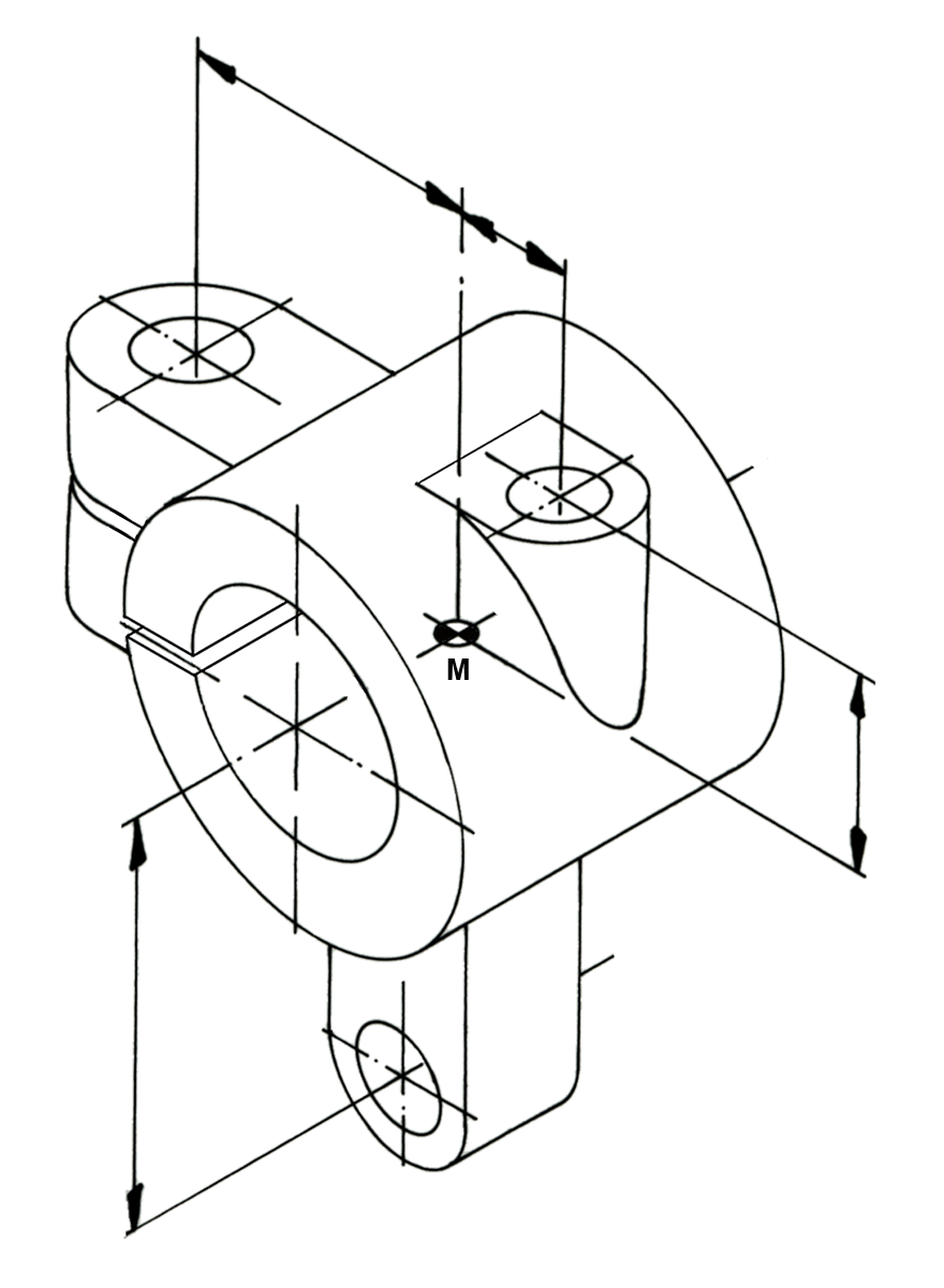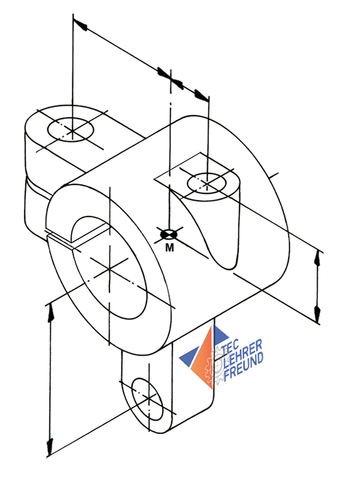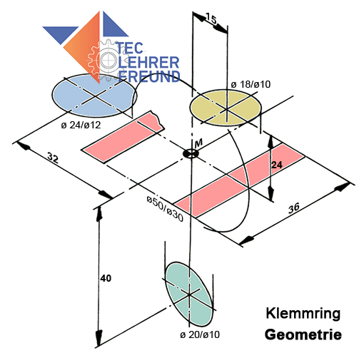 Eine Herausforderung ist zweifelsohne die Darstellung der Perspektive. Sie ist hier zwar als Isometrie1) bereits vorgegeben, sie neu zeichnen, wird trotzdem für manchen nicht einfach sein. Unser Vorschlag: Wir zeichnen zuerst die aus Mittellinien bestehende Grundgeometrie des Bauteils. Dabei gehen wir von der Bauteilmitte M aus. Die im geometrischen Gerüst angegebenen Kreise in den Farben blau, gelb und grün liegen mit Ausnahme des Kreises ø18/ø10 (gelb) in der Mitte ihrer Einzelformen. Von dort die Grenzen der Bauformen zu ermitteln, ist nicht schwierig.