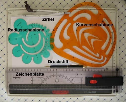 ... und welche Zeichenwerkzeuge braucht man für solche Aufgaben? Zuerst normale Zeichenutensilien wie das Zeichenbrett. Auf dem Bild haben wir den Radiergummi und das Zeichendreieck vergessen.