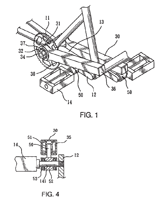 Entsprechend weisen die Antriebselemente (30) zwischen Kurbel (12) und Kettenrad (11) einen längeren Kraftarm auf, um das Drehmoment der Pedalvorrichtung (20) zu steigern, sodass der Radfahrer die Pedale energiesparend bedienen kann und sich sein Energieaufwand und sein manueller Aufwand reduzieren.