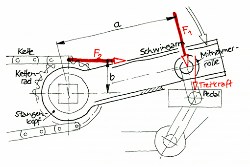 Die Pedal-Tretkraft erzeugt an der Mitnehmerrolle die Kraft F1. Sie ist annähernd so groß wie die Tretkraft. Daraus entsteht das Schwingarm-Moment