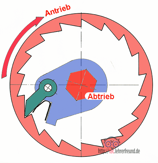 [tec.LEHRERFREUND-Einschub: Erläuterung der Funktion einer vereinfachten Sperrrad-Kupplung. (Bild unten). Die Hülse mit Innenverzahnung dreht nach rechts: Die innen liegenden Teile mit dem Sechskant werden von der Klinke (grün) mitgenommen.