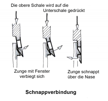 Nach dem gewaltsamen Öffnen mit einem Schraubendreher waren die Schalen an den Fugenkanten beschädigt. Kein Wunder: Sie sind absichtlich so montiert, dass man sie nicht mehr öffnen kann. Der Mechanismus dafür besteht aus biegsamen Zungen, die an der einen Schale angebracht sind und Nasen an der anderen. Die Zungen haben Fenster, in die die Nasen beim Zusammendrücken der Schalen hinein schnappen.