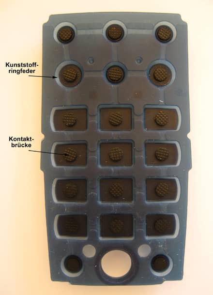 Im ganzen Hörer wird keine Druckfeder verwendet. Die Tasten bestehen aus Silikon, einem weichen Kunststoff mit gummiähnlichen Eigenschaften. Sie sind über eine dünne Membrane mit ihrem Kunststoffbett verbunden. Die Membrane verformt sich nach dem Hineindrücken der Taste und federt danach zurück. Das Krafteck zeigt, dass die schräg nach oben wirkende Kraft eine senkrechte Komponente besitzt.