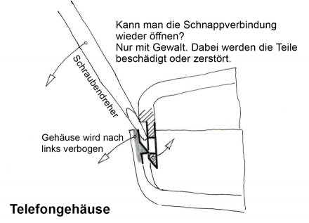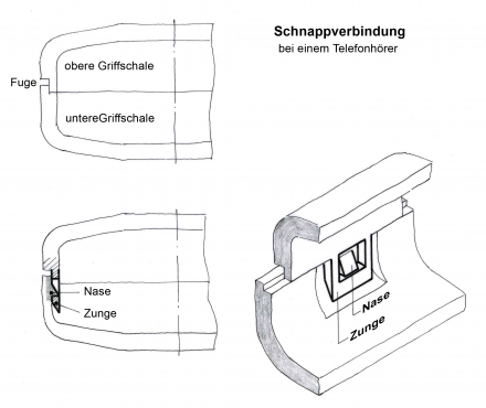 Jeder Telefonhörer ist anders konstruiert. Aber die meisten bestehen aus zwei bootsähnlichen Schalen, die ungefähr in der Mitte getrennt sind. Der Hörer muss aus zwei Teilen bestehen, damit man bei der Montage das Innenleben - Platine, Mikrofon, Display, Batterien - einbauen und befestigen kann. Da aber nirgends eine Schraube zu entdecken ist, stellt sich die Frage: Wie halten die beiden Halbschalen zusammen?
