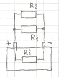 2. Eine Batterie mit 44 Ah und einer Ruhespannung 12,7 V besitzt einen Innenwiderstand von 25 mΩ. Sie versorgt zwei parallel geschaltete Außenwiderstände R1 = 5 Ω und R2 = 210 Ω