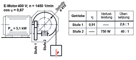 f) Gewicht F in daN, das bei der abgegebenen Leistung (Aufgabe e) hochgezogen wird.