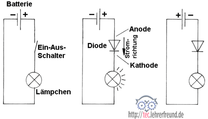Wir nehmen eine Batterie als Stromquelle und als Verbraucher ein Lämpchen. In einem einfachen Stromkreis wird man das Lämpchen mit einem Schalter ein- und ausschalten. Anstatt eines Ein-Aus-Schalters kann man auch eine Diode setzen. Dioden sind sehr einfache Halbleiterbauelemente.