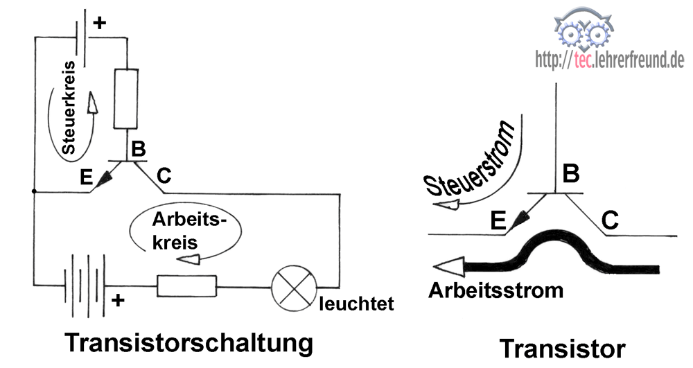 Mit Hilfe eines kleinen Basisstromes wird ein großer Arbeitsstrom gesteuert. Das Verhältnis von Ausgangsstrom zum Eingangsstrom bezeichnet man als die Stromverstärkung des Transistors. Sie kann ganz grob bis zum 100-Fachen gehen.