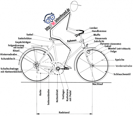 Hat man sich für das Projekt entschieden, ist es zu Beginn eine Unterrichtsstunde wert, die Namen der Bauteile des Fahrrads zu klären (Klick aufs Bild zum Vergrößern). Folgende Bauteile sind auf der Zeichnung veranschaulicht: Sattel, Sattelstütze, Gepäckträger, Felgenbremse mit Sockel, Ritzel, Hinterradnabe, Schutzblech, Schaltschwing mit Kettenrädchen, Kette, Seitenständer, Kettenblatt, Tretlager, Kurbelarm mit Pedal, Nachlauf, Schlauchventil, Vorderradnabe, Speiche(n), Felge, Mantel mit Schlauch, Gabel, Dynamo (Generator), Fahrlich, Steuersatz, Muffe, Handbremse, Lenker.