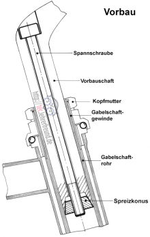 Der Vorbau kann nach Belieben in das Gabelschaftrohr geschoben und dann festgeklemmt werden. Mit dem Vorbau lässt sich die Haltung des Fahrers auf dem Fahrrad regulieren.