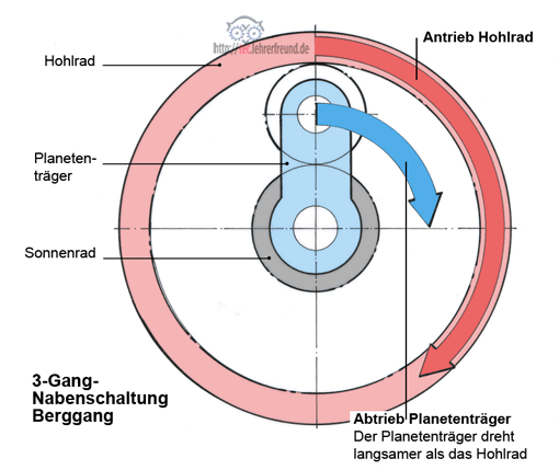 Um das auf der Hinterachse feststehende Sonnenrad drehen sich drei Planetenräder (im Bild ist nur ein Rad gezeichnet). Dabei treibt der Planetenträger über das Planetenrad das Hohlrad und die Nabe an. In den Skizzen ist der Planetenträger als Hebel dargestellt. In der konkreten Konstruktion jedoch ist es in der Regel ein geteilter Scheibenring, in dem die drei Planetenräder gelagert sind.