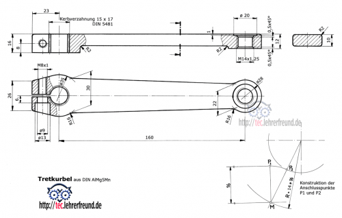 Tretkurbel, Lösung (Zeichnung in Draufsicht, Seitenansicht)
