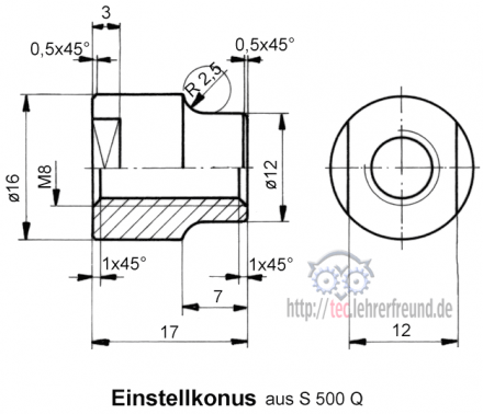 - Einstellkonus nach den Angaben in 2 Ansichten zeichnen und bemaßen; die Vorderansicht im Halbschnitt darstellen.