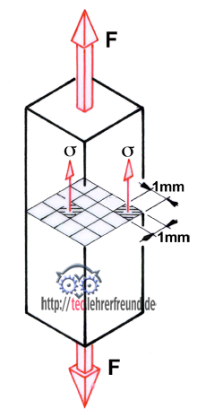 Skizze: Wird ein Stahlstab mit der Kraft F gedehnt, dann geht man davon aus, dass sich diese Kraft gleichmäßig auf die einzelnen Quadratmillimeter des Querschnitts S verteilt. Die pro Quadratmillimeter übertragene Kraft wird als Spannung σ (sigma, griech. Buchstabe) bezeichnet.