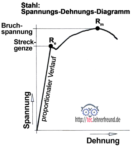 Stahl verhält sich beim Auseinanderziehen zunächst elastisch wie eine Zugfeder: Die Zugprobe verlängert sich im Verhältnis der Zugkraft, d. h.: doppelte Kraft, doppelte Verlängerung, dreifache Kraft, dreifache Verlängerung, usw. Dies ist ein proportionales Verhalten, das an einem bestimmten Punkt zu Ende ist. Dieser Punkt ist die Streckgrenze Re. Bei weiterer Belastung bricht die Zugprobe sehr schnell. Der höchste erreichte Spannungswert ist die Zugfestigkeit Rm. Die (alte) Stahlkurzbezeichnung St 37 (heute S235JR) besagt: Es handelt sich um einen Stahl, der ab einem Rm = 370 N/mm2 brechen darf.
