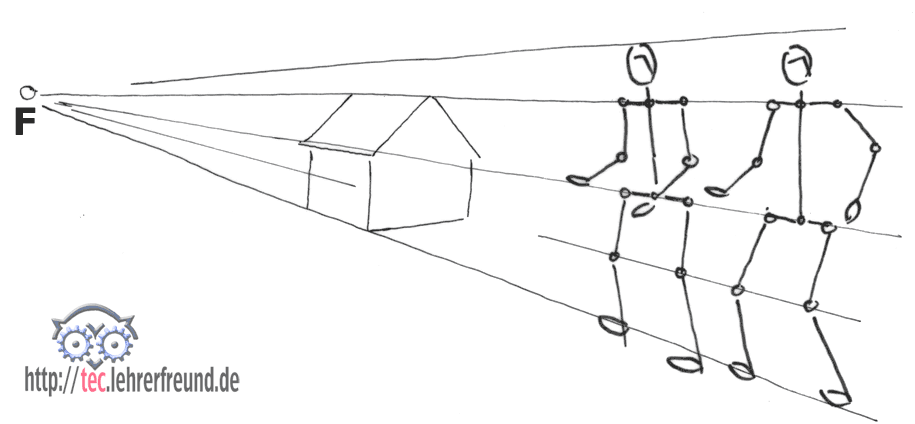 Lebendig sehen Strichmännchen aus, wenn sie einen perspektivischen Zug aufweisen. Der Fluchtpunkt F verrät es: Wie beim Haus sind alle Ausdehnungen des Männchens - Schultern, Hüfte und Füße - auf F hin ausgerichtet.