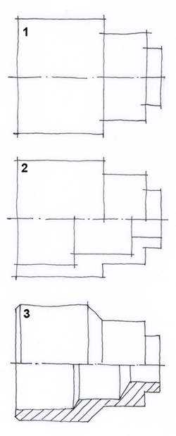 2. Innere Form im Halbschnitt zeichnen, zunächst ohne kegelige Übergänge. (Erinnerung: Der Halbschnitt liegt - nach Norm - unten).