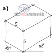 Quader, Skizze 1: isometrische ProjektionDas Geheimnis hinter guten technischen Skizzen liegt in der Beherrschung der perspektivischen Darstellung.