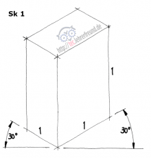 Eine sehr einfache Perspektive ist die isometrische Projektion (genauer: die isometrische Projektion nach DIN ISO 5456–3), wie in Skizze Sk1.