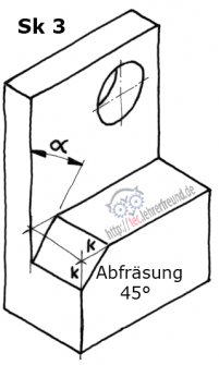 Es kommt eine 45°-Abschrägung hinzu. Die Schwierigkeit ist, dass sie wegen der perspektivischen Verzerrung nicht unter 45° gezeichnet werden darf: Der Winkel α ist kleiner als 45°! Man trägt stattdessen die beiden Katheten k auf und verbindet ihre Endpunkte.