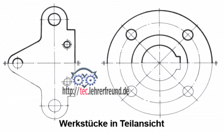Symmetrische Werkstücke können in Teilansichten dargestellt werden, wenn sie damit weiterhin eindeutig zu verstehen sind. Das grafische Symmetriesymbol, zwei kurze Querstriche am Ende der Mittellinie, besagen, dass ein symmetrisches Teil nur halb gezeichnet wurde.
