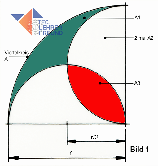 Die Teilflächen heißen A, A1, 2 mal A2 und A3. Die beiden Halbkreise überlappen sich; so entsteht die blattförmige Teilfläche A3.