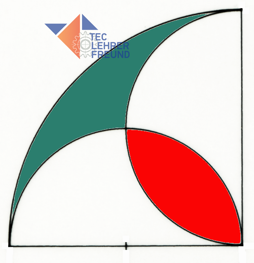 In einen Viertelkreis mit dem Radius r sind zwei Halbkreise eingezeichnet, deren Durchmesser dem Radius des Viertelkreises entsprechen. Durch die Konstruktion entstehen zwei geschlossene Flächen, die wir in unserer Skizze rot und grün gekennzeichnet haben.