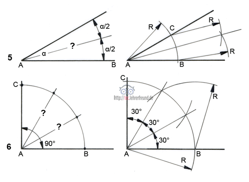 Lösung: Bei A einstechen und einen beliebigen Radius R ziehen. Diesen Radius auch von den Schnittpunkten B und C aus schlagen. Die Schnittpunkte mit dem ersten Radius R sind jeweils 30° voneinander entfernt. 3 x 30° = 90°.