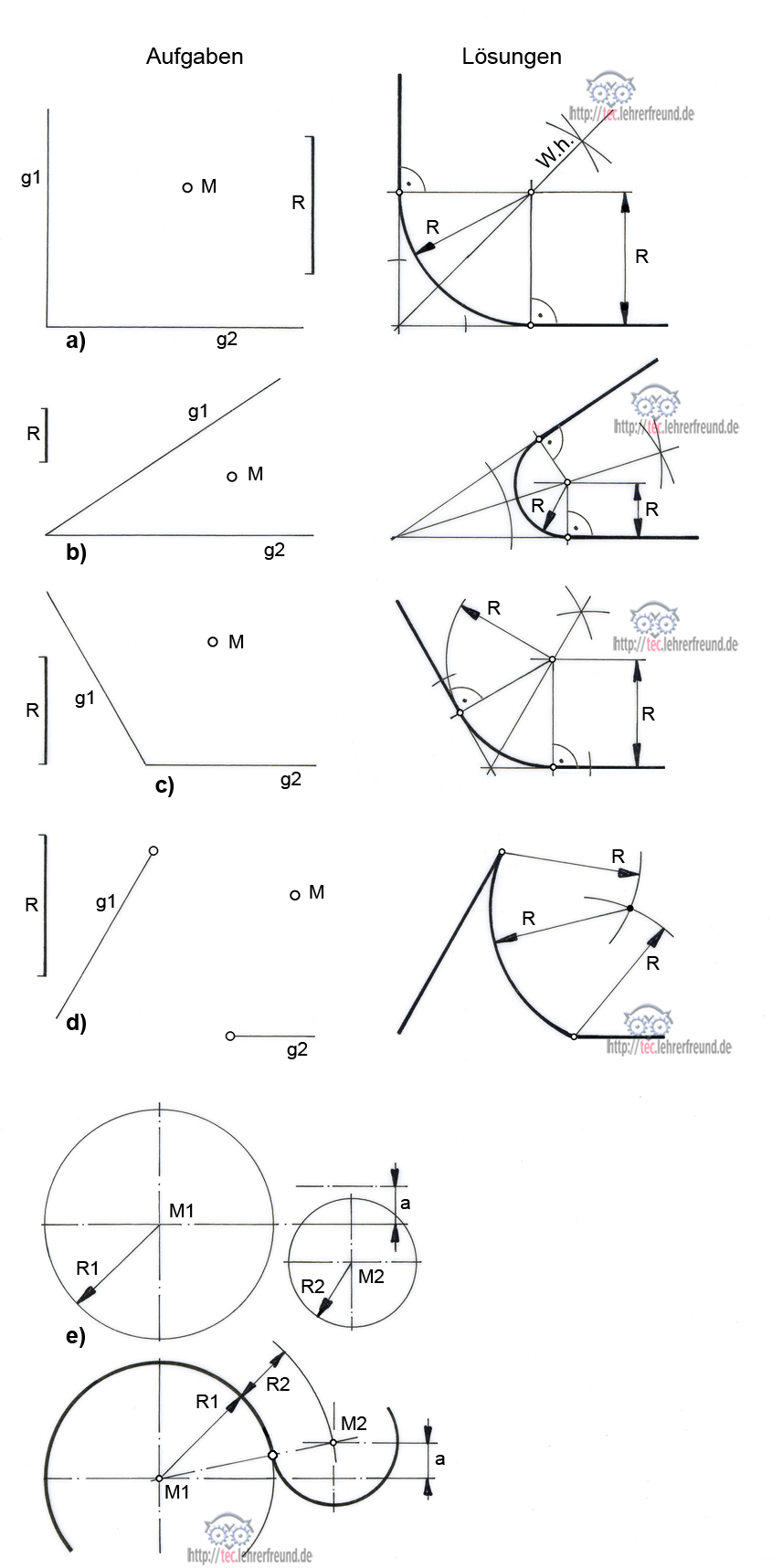 Geometrisch konstruieren heißt, eine vorgegebene Figur mit Zirkel und Lineal exakt darzustellen. In diesem Beitrag wird dies am Beispiel von Kreisanschlüssen gezeigt. Dabei nehmen wir uns bei jeder Aufgabe vor, als Erstes die Anschlusspunkte zu konstruieren. Danach wird der Kreisbogen eingezeichnet. (In Aufgabe d) sind die Anschlusspunkte bereits gegeben).