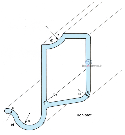 Das unten dargestellte Hohlprofil hat Formen, an denen wir die Darstellung wichtiger Grundkonstruktionen erläutern wollen. Die Grundkonstruktionen sind anschließend mit a), b), c), d) und e) gekennzeichnet.