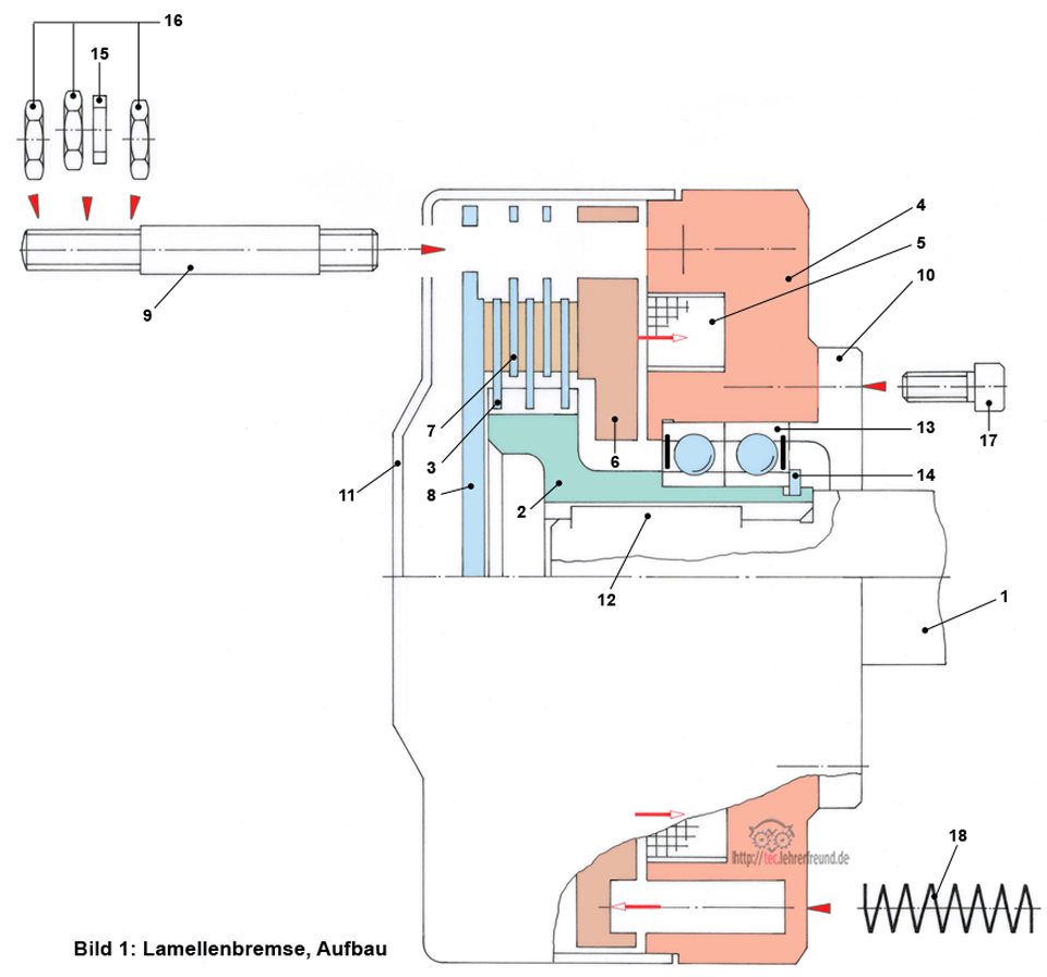 2. Welche Bauteile bewirken das Schließen der Bremse? Die Federn 18 und der Druckring 6.