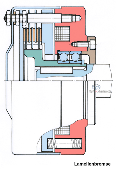 1 = Antriebswelle; 2 = Mitnehmernabe; 3 = Lamellen mit Bremsbelägen; 4 = Magnet; 5 = Spule;