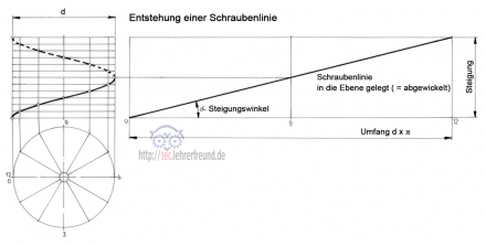 Eine Schraubenlinie ( = Gewindegang) entsteht, wenn ein Punkt (ein Drehmeißel) auf einem sich gleichmäßig drehenden Zylinder in Richtung der Drehachse mit gleichbleibender Geschwindigkeit bewegt wird.
