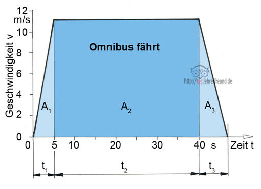 Das Geschwindigkeit-Zeit-Schaubild unten zeigt Fahrabläufe eines Busses. Während der Beschleunigungszeit von 5 Sekunden nimmt seine Geschwindigkeit in gleichen Zeitabschnitten um den gleichen Betrag bis auf 40 km/h zu. Nach weiteren 35 Sekunden beginnt er zu bremsen; nach 7 s Bremszeit bleibt der Bus stehen.