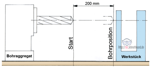 Bohraggregat. Die Skizze zeigt den Bewegungsablauf beim Eilgang zwischen Startbeginn und Bohrbeginn. Angaben: