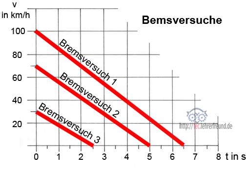 Bremsversuche an Motorrädern: Drei Abbremsversuche werden in einer Grafik festgehalten. Lesen Sie die Werte aus der Grafik heraus und berechnen Sie damit die Bremswege s1, s2 und s3