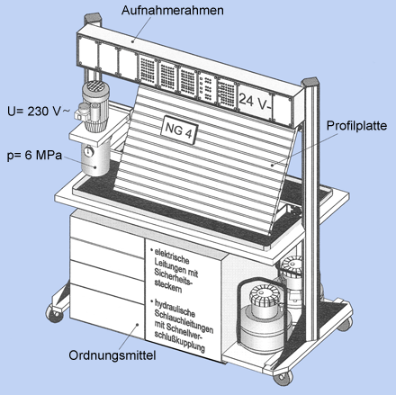 Bei der Vorstellung der Hydraulikkomponenten bieten nach wie vor Folien, Videos, Schnittmodelle oder - recht teuer - Klarsichtmodelle Möglichkeiten, den Aufbau und die Funktion zu erklären. Ein Lehraggregat gibt zwar keinen Einblick in das Innenleben eines Ventils, zeigt aber realistisch, wie eine Schaltung arbeitet.