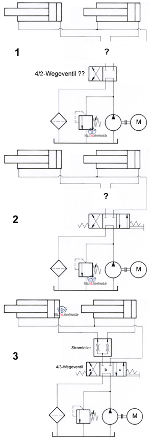 Aufgabenstellung: Die Kolben zweier doppelt wirkender Arbeitszylinder sollen gleichzeitig ausfahren. Das Thema ist nicht ganz einfach; als Grundlage benötigt es Erfahrungen mit schon bekannten, einfacheren Schaltungen.