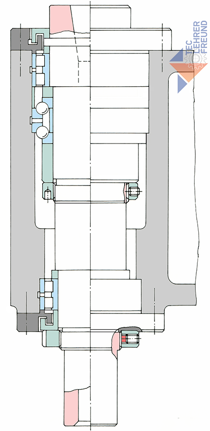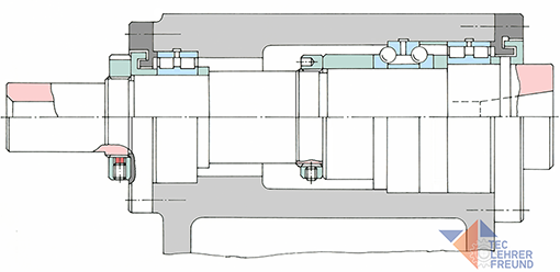 Unsere Zeichnung zeigt das Prinzip einer wälzgelagerten Hauptspindel. Die Hauptspindel ist im Spindelgehäuse gelagert. Links (nicht gezeichnet) sitzt der Riemenscheibenantrieb, rechts endet die Spindel mit dem Spindelflansch und der kegeligen Werkzeugaufnahme. Möglichst nahe an der Bearbeitungsstelle sitzt das Hauptlager – hier ein zweireihiges Zylinderrollenlager und ein zweireihiges, zerlegbares Axial-Schrägkugellager. Das in der Nähe der Riemenscheibe eingebaute Nebenlager ist ebenfalls ein zweireihiges Zylinderrollenlager.